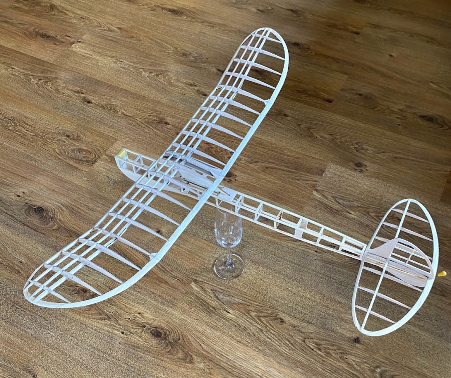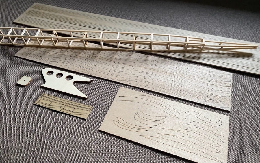 Stavebnice rekreačního modelu poháněného gum.svazkem. Kompletní stavebnice-budete potřebovat jen lepidlo a model.nářadí.